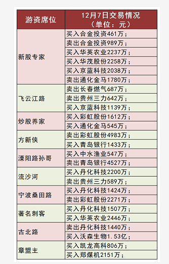 12月3日晚,丹化科技发布交易异常波动公告,称公司目前的PGA项目处于研发和试验阶段,仍存在较大的不确定性。而从基本面来看,公司去年全年和今年前三季度公司均处于亏损状态,是名副其实的低价绩差股。然而游资却不会放弃炒作,丹化科技在11月30日至12月7日期间,6个交易日实现了5个涨停板。今日涨停背后,游资纷纷出动,其中“流沙河”买入2200万元,宁波桑田路买入1424万,“著名刺客”买入1507万;而卖出席位上,古北路今日卖出1440万。