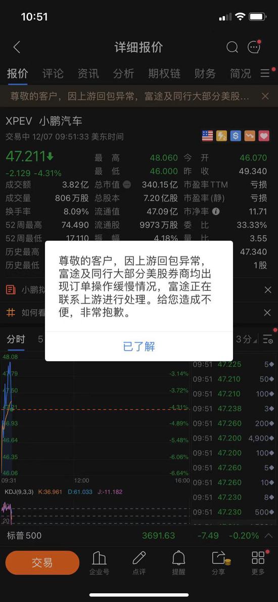 富途证券也称:“尊敬的客户,因上游回包异常,富途及同行大部分美股券商均出现订单操作缓慢情况。富途第一时间联系上游进行处理,当前问题已解决,请您关注订单情况并以实际订单状态为准。给您造成不便,非常抱歉。”