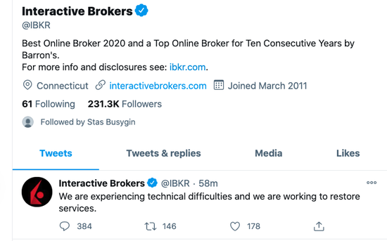 按日均收入交易量计算的美国最大互联网券商盈透证券(Interactive Brokers)也于美东时间早6点半左右遇到故障,美股刚开盘时的用户报错数量最多,美股开盘两小时后也一直有人称平台服务没有恢复。