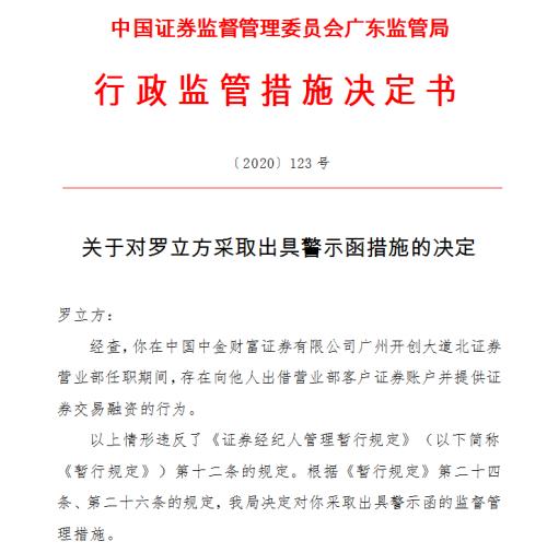 在此之前,今年8月,同样是中金财富证券广州开创大道北营业部,其员工罗某方因向他人出借营业部客户证券账户,并提供证券交易融资,同样被广东证监局出具警示函。