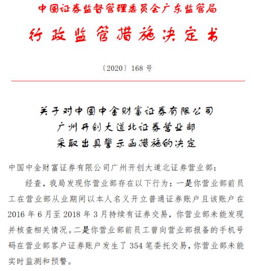 基于此,广东证监局认为,该营业部对员工违规行为未能及时发现并有效实施合规管理,最终对其采取出具警示函的监督管理措施。