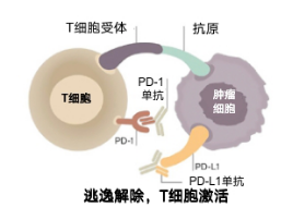肿瘤细胞表面表达的PD-L1可以与T细胞表面的PD-1结合;PD-1与PD-L1结合后,T细胞发生失活,肿瘤不能被免疫系统清除;然而,PD-1单抗或PD-L1单抗分别与T细胞表面的PD-1或肿瘤细胞表面的PD-L1结合,阻断PD-1与PD-L1的相互作用,使T细胞恢复肿瘤杀伤功能