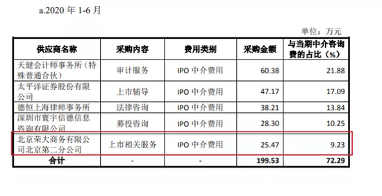 12月1日,华蓝集团的招股书披露,其中显示,支付给北京荣大商务北京第二分公司25.47万元采购上市相关服务,占当期中介咨询费用占比为10.25%。