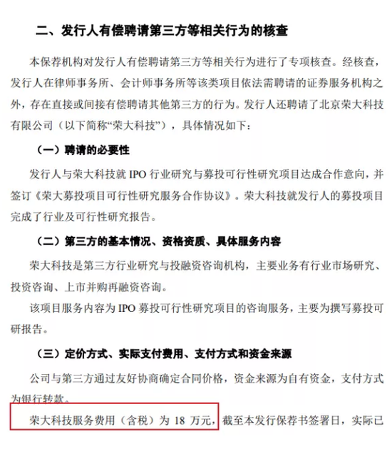 11月17日,中信建投关于拟上市企业无锡江南奕帆电力传动科技股份有限公司的上市发行保荐书中提及,江南奕帆有偿聘请了荣大科技作为第三方机构,并在公告中阐述了聘请的必要性表示,荣大科技就发行人的募投项目完成了行业及可行性研究报告,服务费用为18万元。