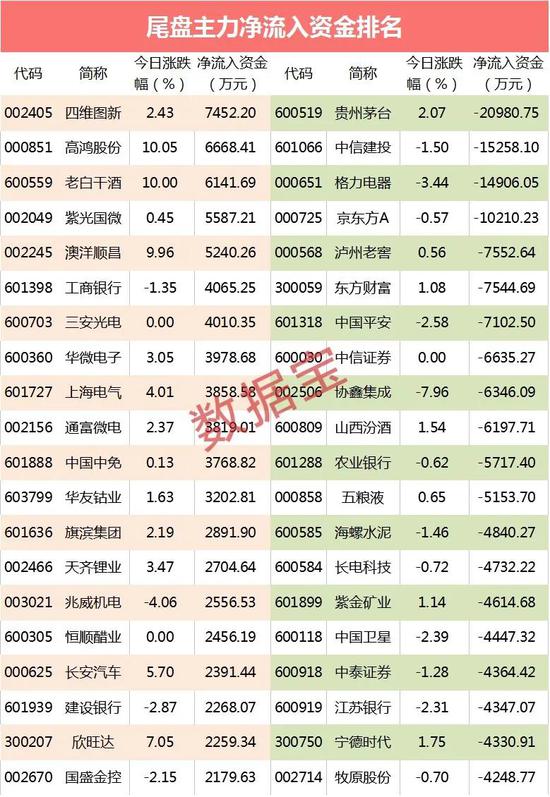贵州茅台、中信建投、格力电器、京东方A等4只个股尾盘流出资金超亿元。连续两日创新高的贵州茅台尾盘资金大幅流出2.1亿元。尾盘多只金融股资金大幅流出,除上述的中信建投外,东方财富、中国平安、中信证券等流出额均超5000万元。