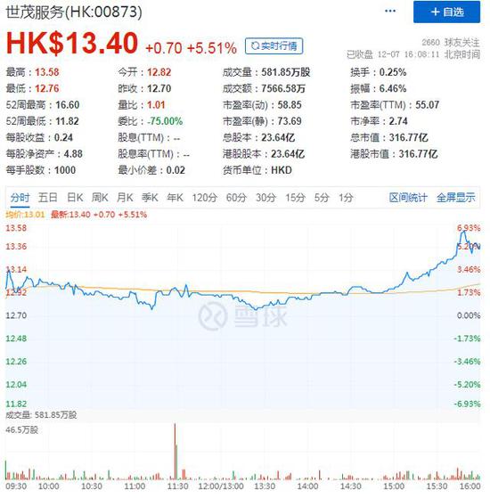 截至北京时间12月7日港股收盘,世茂服务股价上涨5.51%,报13.40港元。