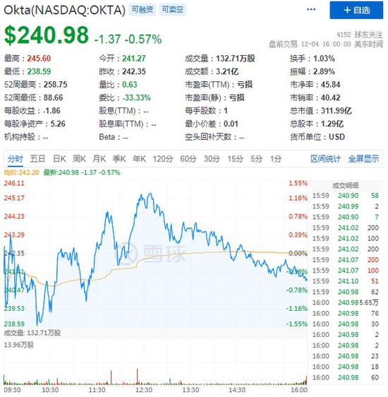截至美东时间12月4日美股收盘,Okta股价下跌0.57%,报240.98美元。