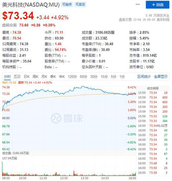 截至美东时间12月4日美股收盘,美光科技股价上涨4.92%,报73.34美元。