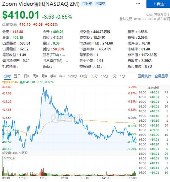 截至美东时间12月4日美股收盘,Zoom股价下跌0.85%,报410.01美元。