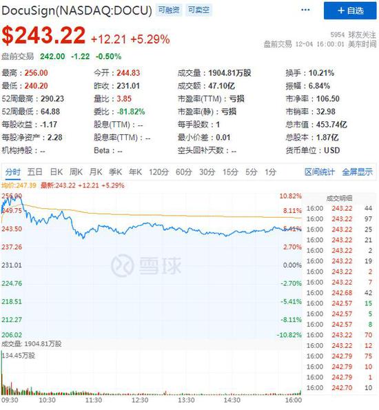 截至美东时间12月4日美股收盘,DocuSign股价上涨5.29%,报243.22美元。