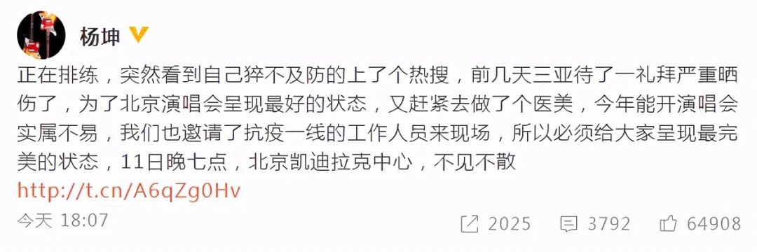 12月7日傍晚,杨坤在个人社交网络平台发文回应此事,解释自己满脸通红是因为在三亚严重晒伤,还顺便宣传了自己即将在北京举行的演唱会。