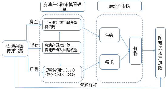 根据管理对象的不同,我国房地产金融审慎管理工具主要包括面向银行、房企和居民三类工具。面向银行的管理工具主要包括房地产贷款比例限制、房地产贷款风险权重,如限制银行房地产贷款比例不能超过新增贷款比例的30%。面向房企的管理工具主要包括对房企融资规模的限制,如“三道红线”新规,从而管控房企的杠杆水平。面向居民的管理工具主要包括贷款价值比(LTV)、债务收入比(DTI)等指标。房地产金融审慎管理,核心是通过管理房企、居民的杠杆,从而降低房地产系统性风险。