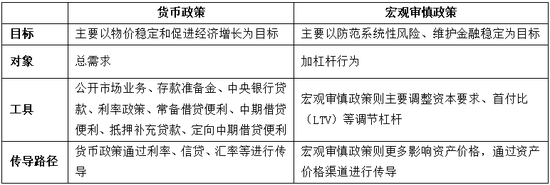 宏观审慎政策与货币政策有明显区别。宏观审慎政策与货币政策都具有宏观效应和逆周期调节特征,二者的区别主要在于:(1)目标不同,货币政策主要以物价稳定和促进经济增长为目标,而宏观审慎政策则主要以防范系统性风险、维护金融稳定为目标;(2)调节对象不同,货币政策主要用于调节总需求,而宏观审慎政策则更多针对加杠杆行为;(3)工具不同,货币政策以利率等作为工具,宏观审慎政策则主要调整资本要求、杠杆水平、首付比(LTV)等;(4)传导路径不同,货币政策通过利率、信贷、汇率等进行传导,而宏观审慎政策则更多影响资产价格,通过资产价格渠道进行传导。