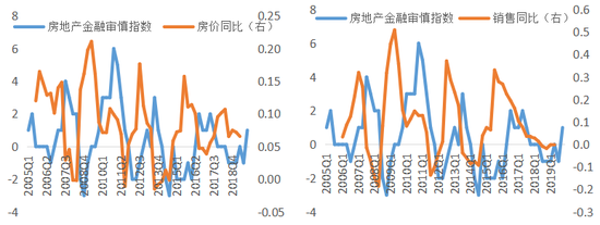 图:房地产金融审慎指数走势与房价变化、商品房销售面积变化比较