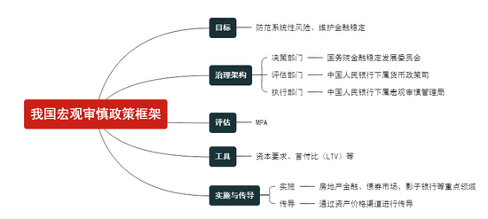 我国宏观审慎政策框架基本形成。宏观审慎政策本质上采用的是宏观、逆周期、跨市场的视角,实行自上而下的衡量方法,以防范系统性风险为主要目标,着力于减缓金融体系的顺周期波动和跨市场风险传染对宏观经济和金融稳定造成的冲击。宏观审慎政策框架是包括政策目标、治理架构、评估、工具、政策实施与传导等一系列组合的总称。目前,我国宏观审慎政策框架基本成型,治理架构以国务院金融稳定发展委员会和中国人民银行为主导,央行专设宏观审慎管理局,房地产金融审慎管理制度是宏观审慎政策的重要组成部分。