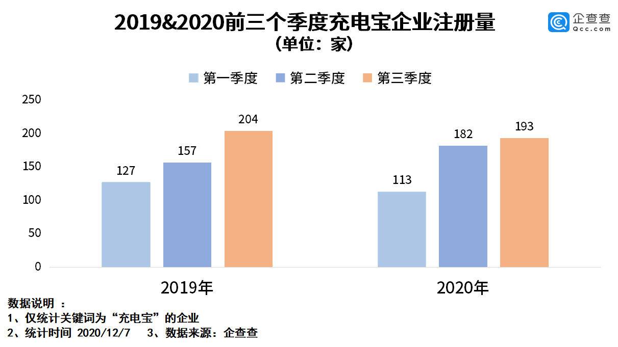 企查查数据显示,2020年前三季度,充电宝相关企业一共新注册488家,与去年同期数据持平。其中,第一季度注册量是113家,第二季度注册量是182家,第三季度注册量是193家。