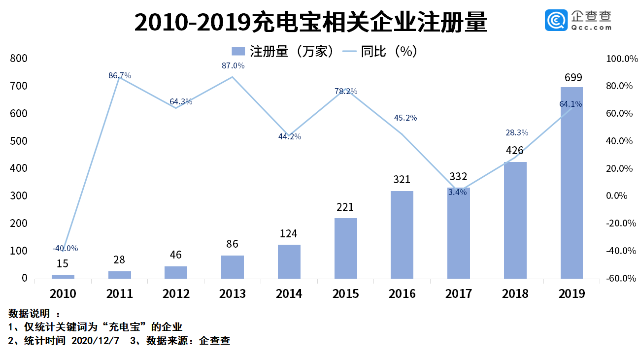 从企业成立时间来看,企查查数据显示,过去十年来,我国充电宝相关企业的注册量不断增长。2019年新注册了699家,同比增长64.1%,是过去十年中注册量最多的一年,相比十年前(2010年)数据增长了46倍。