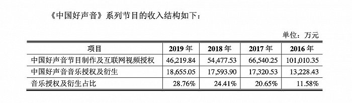 爆火综艺《中国好声音》便是灿星文化的主要收入来源。招股书显示,2017年至2019年,来自《中国好声音》的收入分别为8.38亿元、7.21亿元、6.49亿元,占同期营收的40.72%、43.62%、37.45%。