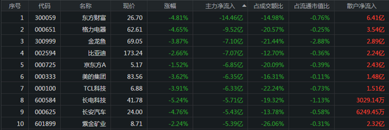 东方财富、格力电器、金龙鱼分别遭主力资金卖出14.46亿元、9.52亿元、7.10亿元。