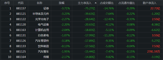 主力资金流出的板块分别是证券、半导体、光电,主力资金流出金额分别为75.27亿元、39.63亿元、28.64亿元,其中散户净流入金额为22.72万元、-1.20亿元、2.55亿元。