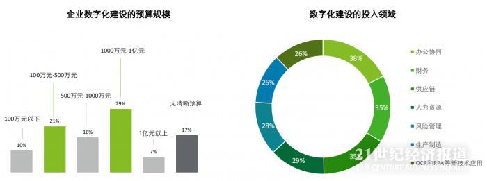 企业也更为重视数字化转型建设。报告显示,未来两年,29%的企业计划在数字化建设的投入金额集中在1000万-1亿元,21%的企业计划投入100万元-500万元。企业预计在数字化建设投入的领域主要在办公协同、财务及供应链方面。
