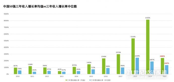 报告显示,本年度“中国50强”三甲的企业分别是:特斯联科技集团有限公司、北京擎科生物科技有限公司和深圳逗爱创新科技有限公司。报告显示,今年中国50强企业的三年营收增长率有所回落,但中位数仍维持在1347%的高位。