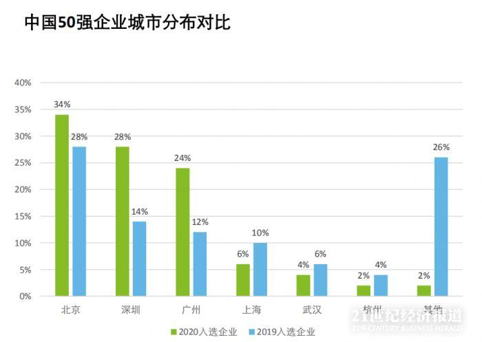在地域分布上,深圳和广州占比翻倍合计达52%,北京依然拥有最多50强企业,占比34%。