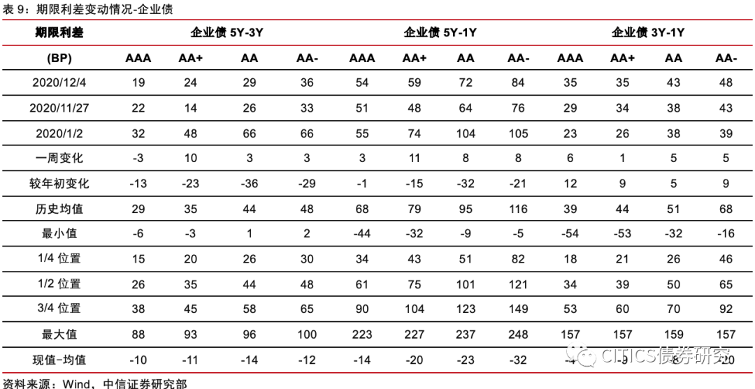 期限利差方面(11.20-12.6):(1)中短票期限利差变动不一,整体走阔。其中AAA中票5Y-3Y下行6bps,5Y-1Y下行1bp,3Y-1Y上行4bps;AA中票5Y-3Y下行5bps,5Y-1Y上行1bp,3Y-1Y上行5bps;AA-中票5Y-3Y下行5bps,5Y-1Y上行1bp,3Y-1Y上行5bps。(2)企业债期限利差整体走阔。其中AAA企业债5Y-3Y下行3bps,5Y-1Y上行3bps,3Y-1Y上行6bps;AA企业债5Y-3Y上行3bps,5Y-1Y上行8bps,3Y-1Y上行5bps;AA-企业债5Y-3Y上行3bps,5Y-1Y上行8bps,3Y-1Y上行5bps。