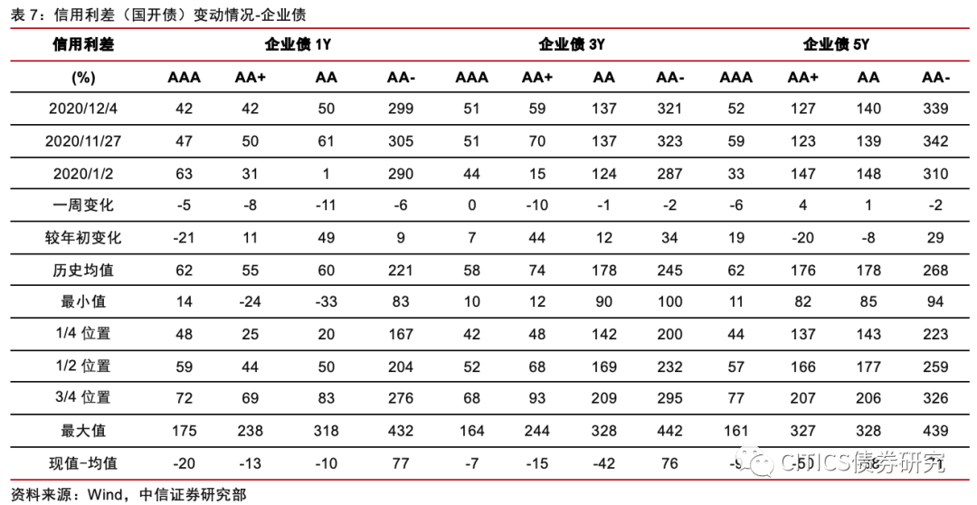 信用利差方面(11.20-12.6):(1)中短票信用利差(国开债)整体有所收窄。其中AAA短融下行1bp,3Y中票上行2bps,5Y中票下行7bps;AA短融下行1bp,3Y中票上行3bps,5Y中票下行5bps;AA-短融下行1bp,3Y中票上行3bps,5Y中票下行5bps.(2)企业债信用利差(国开债)整体收窄。其中AAA企业债1Y下行5bps,3Y未发生变动,5Y下行6bps;AA企业债1Y下行11bps,3Y下行1bp,5Y上行1bp;AA-企业债1Y下行6bps,3Y下行2bps,5Y下行2bps。