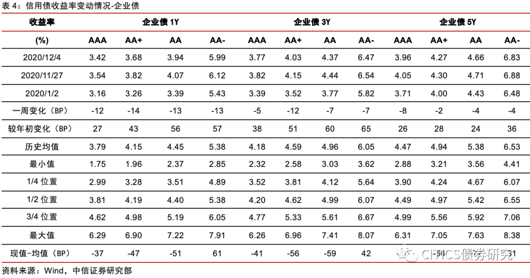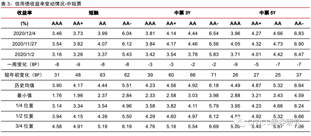 收益率方面(11.30-12.6):(1)中短票收益率下行。其中AAA短融下行8bps,3Y中票下行3bps,5Y中票下行9bps;AA短融下行8bps,3Y中票下行2bps,5Y中票下行7bps;AA-短融下行8bps,3Y中票下行2bps,5Y中票下行7bps。(2)企业债收益率下行。AAA企业债1Y下行12bps,3Y下行5bps,5Y下行8bps;AA企业债1Y下行13bps,3Y下行7bps,5Y下行4bps;AA-企业债1Y下行13bps,3Y下行7bps,5Y下行4bps。