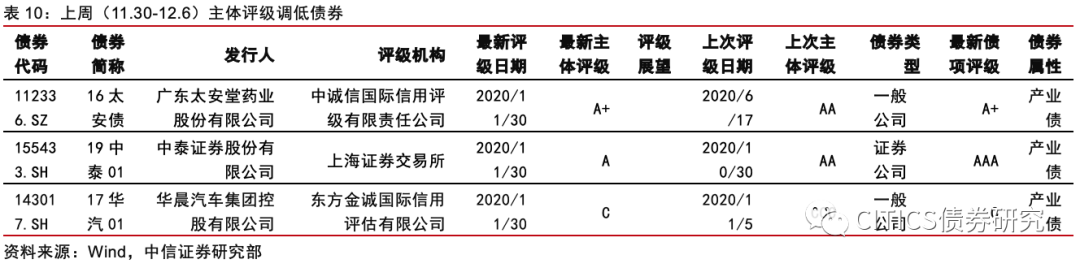上周(11.30-12.6)主体评级调低债券主要集中在3家发行人共43项,如下表所示,主体评级调低债券类型均为产业债。