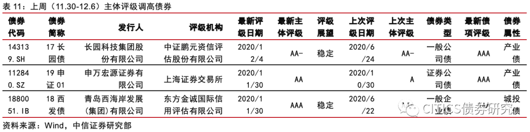 上周(11.30-12.6)主体评级调高债券主要集中在3家发行人共35项,如下表所示,主体评级调高债券类型31只为产业债,4只为城投债。