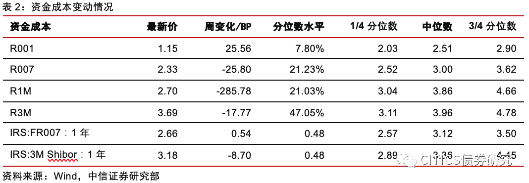 资金成本整体下行。11月30日至12月6日,R0001上行25.56bps,现值1.15%;R007下行25.80bps至2.33%,R1M下行285.78bps至2.70%;R3M下行17.77bps,现值3.69%。