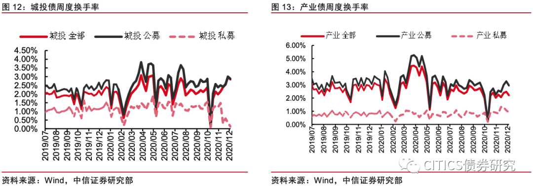城投债换手率下降,产业债换手率下降,交投相对冷清。11月30日至12月6日,城投债周度换手率由2.98%降至2.84%,产业债由2.47%升至2.22%,交投活跃度下降。
