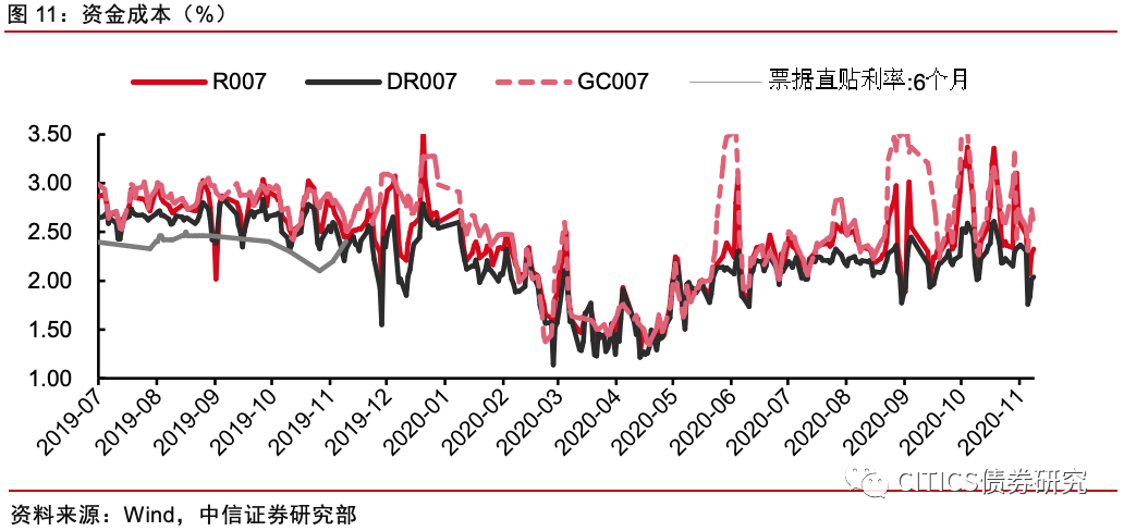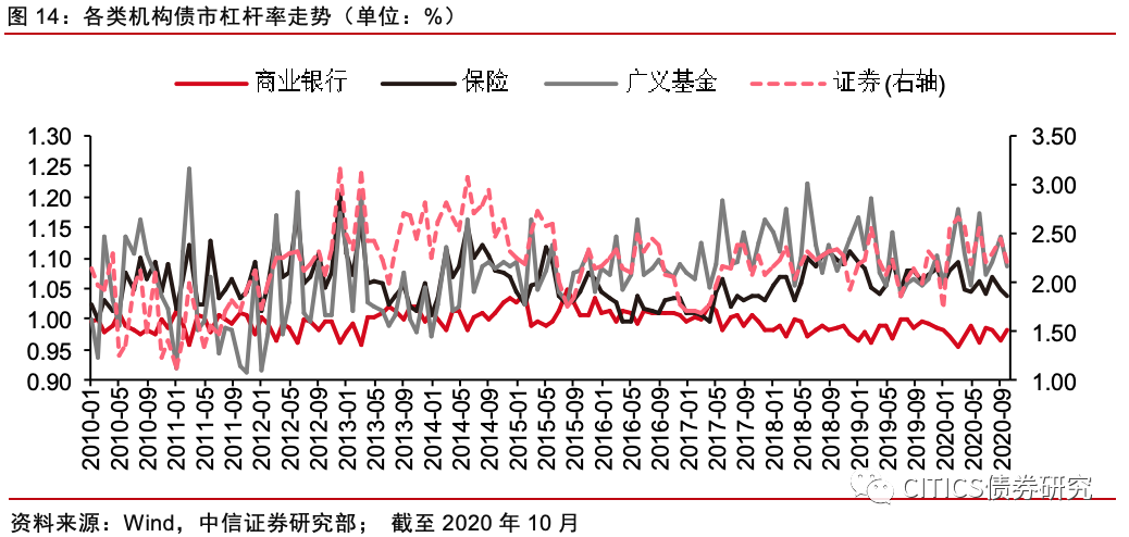 券商和广义基金杠杆回落。截至2020年10月,商业银行、保险、证券、广义基金的债市杠杆率分别为0.98、1.04、2.20和1.09,较前一月分别变动+0.02、-0.01、-0.24、-0.04。