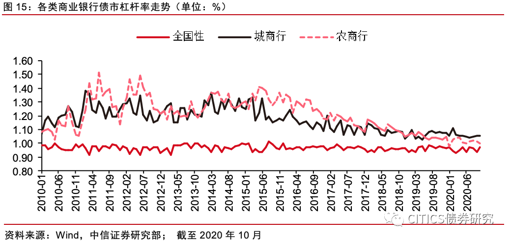 商业银行内部的杠杆率区分度已经不大。截至2020年10月,全国性商业银行、城商行、农商行的债市杠杆率分别为0.97、1.06和1.00,较前一月分别变动+0.03、0、-0.01。