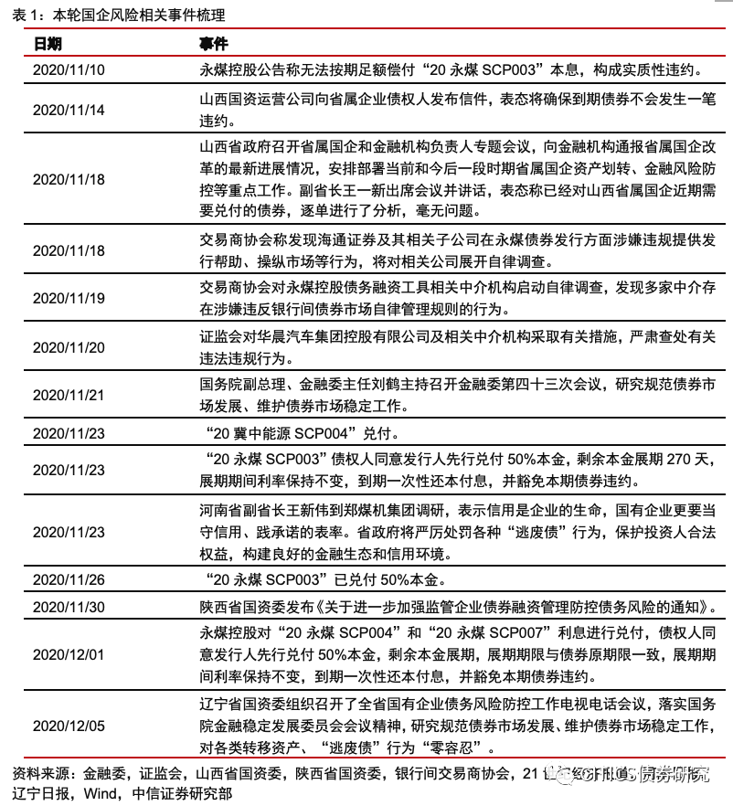 本轮风险已经发酵近1个月,利差抬升幅度明显。虽然国企违约并非首次出现,但11月10日永煤违约仍超预期,导致本轮信用风险开始发酵,截至2020年12月4日,3YAAA、AA+和AA信用利差分别较2020年11月9日抬升17bps、36bps和47bps,抬升幅度已经接近甚至超过前几轮信用冲击,且历时也已经接近1个月。从监管机构和地方政府表态来看,斩断风险传递的意图也十分明显,我们预计本轮利差抬升已经接近尾声,信用债领域危机交易的机会来临,对于收益率未达目标或仍有排名压力的资金而言,这或许是年末最后一次赶超机会。