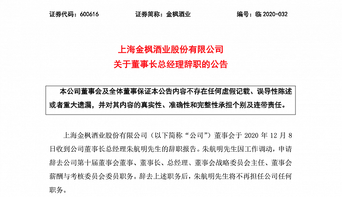 原标题:金枫酒业董事长总经理朱航明因工作调动辞职