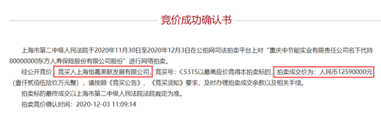 根据上海市第二中级人民法院信息,重庆中节能实业名下代的哈尔滨志阳投资的8000万东方人寿股份在12月3日被拍卖。该笔股权的评估价为1092万元,起拍价仅为765万元。拍卖标的最终成交以上海市第二中级人民法院法院裁定为准。