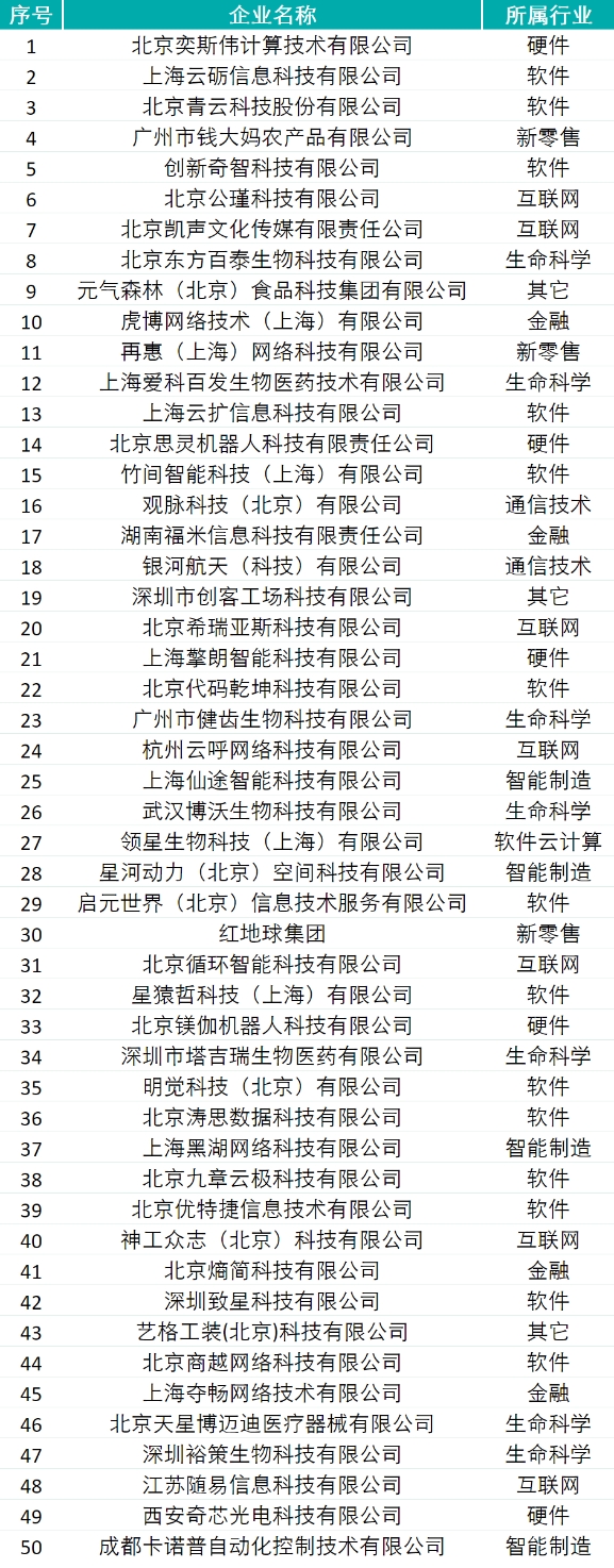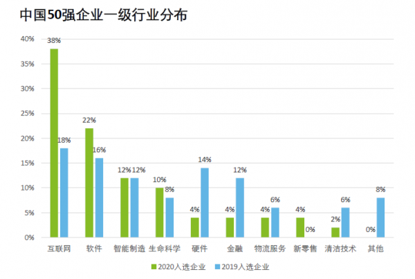 在“新基建”的推动下,互联网企业增长迅速,这也体现在“50强企业”的行业分布方面,互联网企业占比最高,达到38%;软件与硬智能制造领域的企业数量危局第二与第三,占比分别为22%与12%。