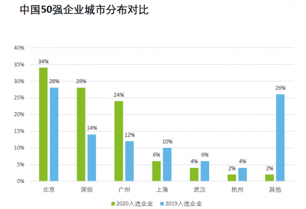在地域分布方面,深圳和广州占比合计达到52%,北京依然拥有最多的“50强企业”,占比34%。一线城市的市场和人才储备保障了企业的飞速发展,“50强企业”开始向北京、广州和深圳等一线城市靠拢,合计占比高达86%。