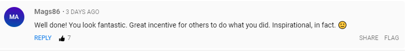 “做得好!你看起来太棒了,激励其他(想健身)的人去行动,太鼓舞人心了。”