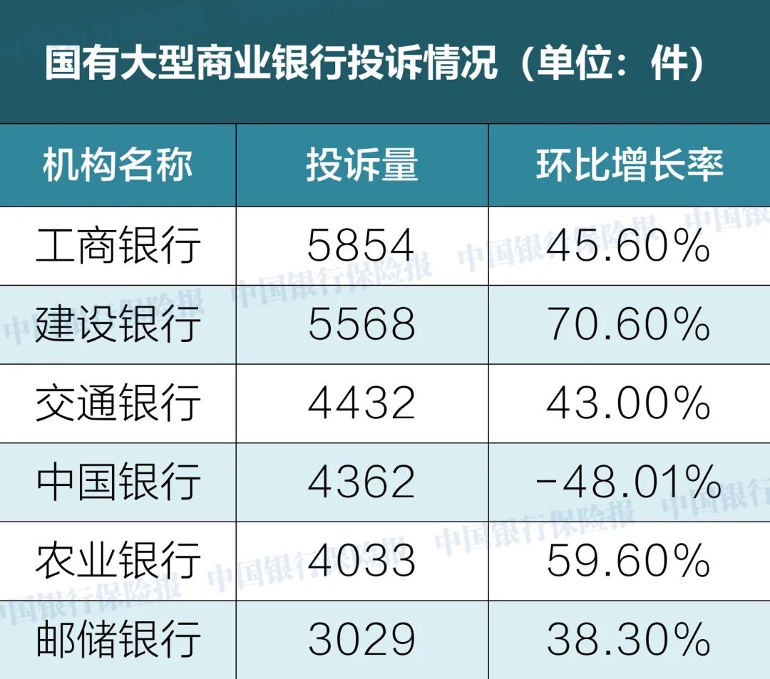 在涉及国有大型商业银行的投诉中,信用卡业务投诉14628件,环比增长82.0%,占国有大型商业银行投诉总量的53.6%。