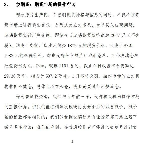 此外举报信还称,部分原片生产商在控制现货价格与信息的同时,不仅不在期货市场上进行卖出套保,反而成为主力多头,大举买入玻璃期货,存在违规逼仓行为。