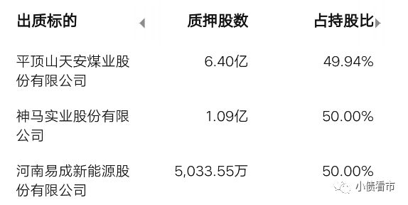 在股权质押方面,平煤神马分别质押平煤股份、神马股份和易成新能6.4亿股、1.09亿股以及5033万股,占其所持股份比例的49.94%、50%和50%,可以看出其股权质押率较高。
