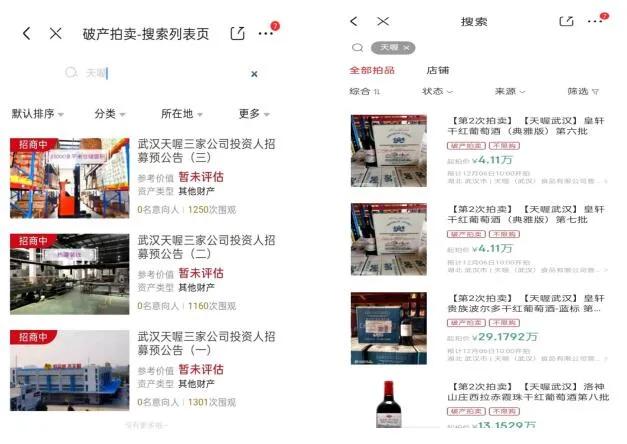 记者注意到,天喔武汉公司还在京东拍卖清仓板块处理相关商品。这些商品均是葡萄酒和起泡酒,共有81批,起拍价从3万多元到30多万元不等,合计起拍价超过1200万元。