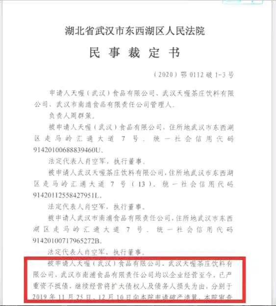 鄂0112破1-3号民事裁定书显示,天喔武汉、武汉茶庄、武汉南浦均以严重资不抵债、继续经营将扩大债权人及债务人损失为由,分别于2019年11月25日、12月10日申请破产清算。武汉市东西湖区人民法院于2020年7月2日裁定其合并破产清算。