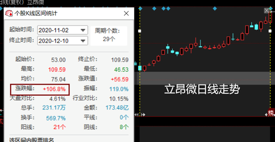 今日半导体板块冲高回落,涨幅仅0.01%,但立昂微却逆势涨停,收盘价109.59元/股,再创历史新高。拉长看,半导体及元件板块自11月2日产生阶段低点后,截止今日,板块整体涨幅仅10.15%。立昂微也在11月2日产生了开板以来的股价低点,但截止今日,立昂微已涨超1倍。立昂微大幅跑赢了板块指数。