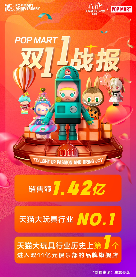 值得瞩目的是,在今年双十一期间,泡泡玛特成为了玩具类目中首家“亿元俱乐部”成员,天猫旗舰店的最终销售额为1.42亿,可谓是其双十一表现最好的一年。