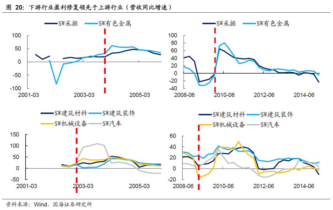PPI上行阶段,周期板块内部的行业表现也会呈现结构性特征。在出口拉动需求增长,进而推动PPI上行的情况下,企业复苏会从中下游(例如汽车、机械设备行业等)向上游(例如煤炭、有色金属行业等)传导,链条式带动企业业绩改善。
